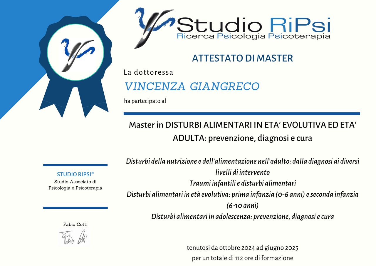 Ho conseguito un Master in Disturbi della Nutrizione e dell’Alimentazione e sto proseguendo la mia formazione specialistica in Psicoterapia sistemico-relazionale presso il Centro Studi di Terapia Familiare e Relazionale.